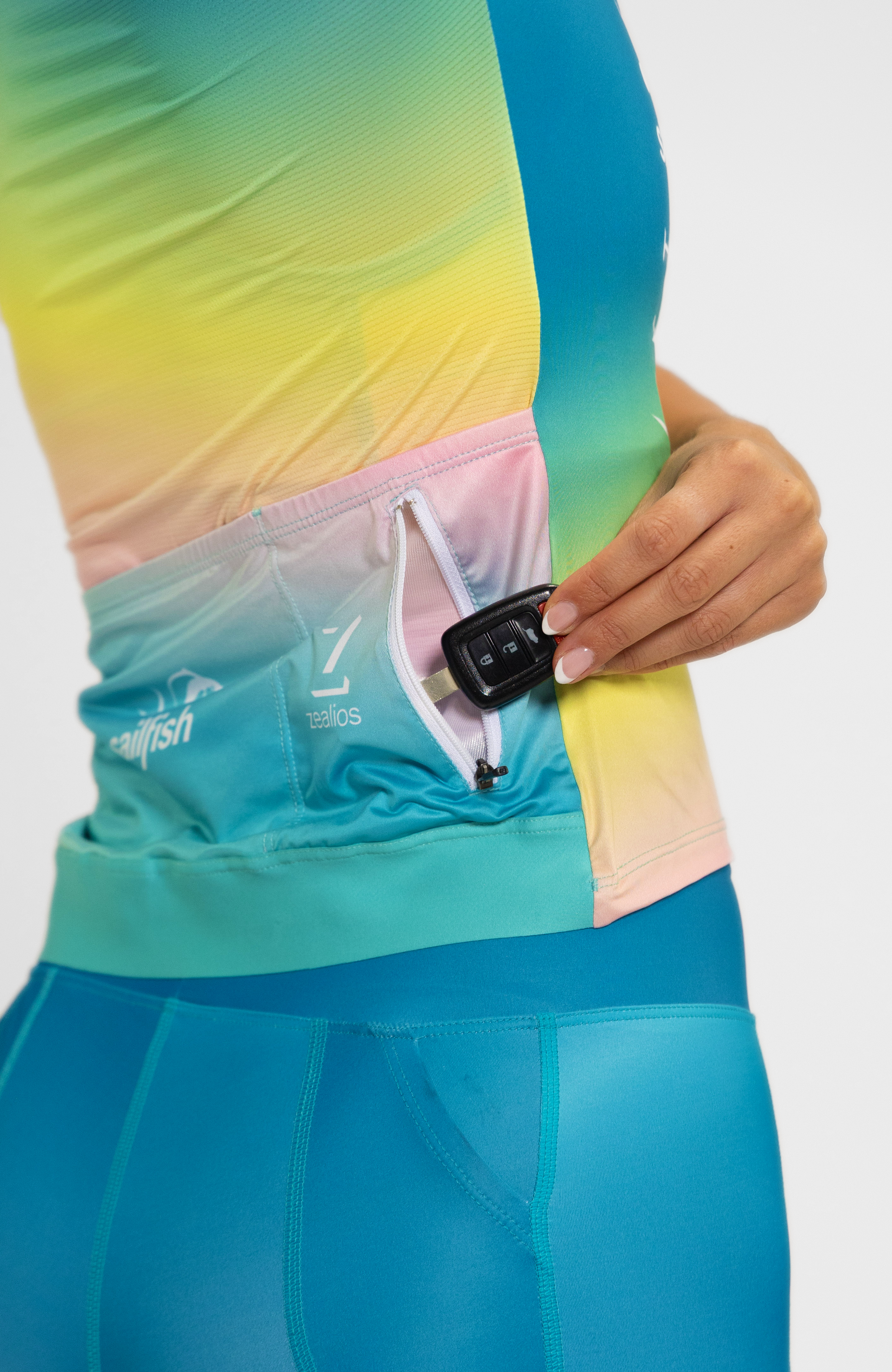 Designed to fit and flatter feminine curves, our women’s cycling jerseys are crazy light and comfortable. They are loaded with functional details requested by cyclists and triathletes at every level. A silicone gripper at the rear hem means your jersey won’t ride up when you’re working in the handlebars, and three deep rear pockets provide a perfect place to stash enough supplies for long rides. Use the zippered waterproof pocket to secure your valuables: ID, money, phone. A full length locking front zipper means you can open and close the jersey with just one hand, so important when you have the other on the handlebars! The bright colors and clean lines of Coeur designs stand out on the road and in any peloton – if they can keep up with you.