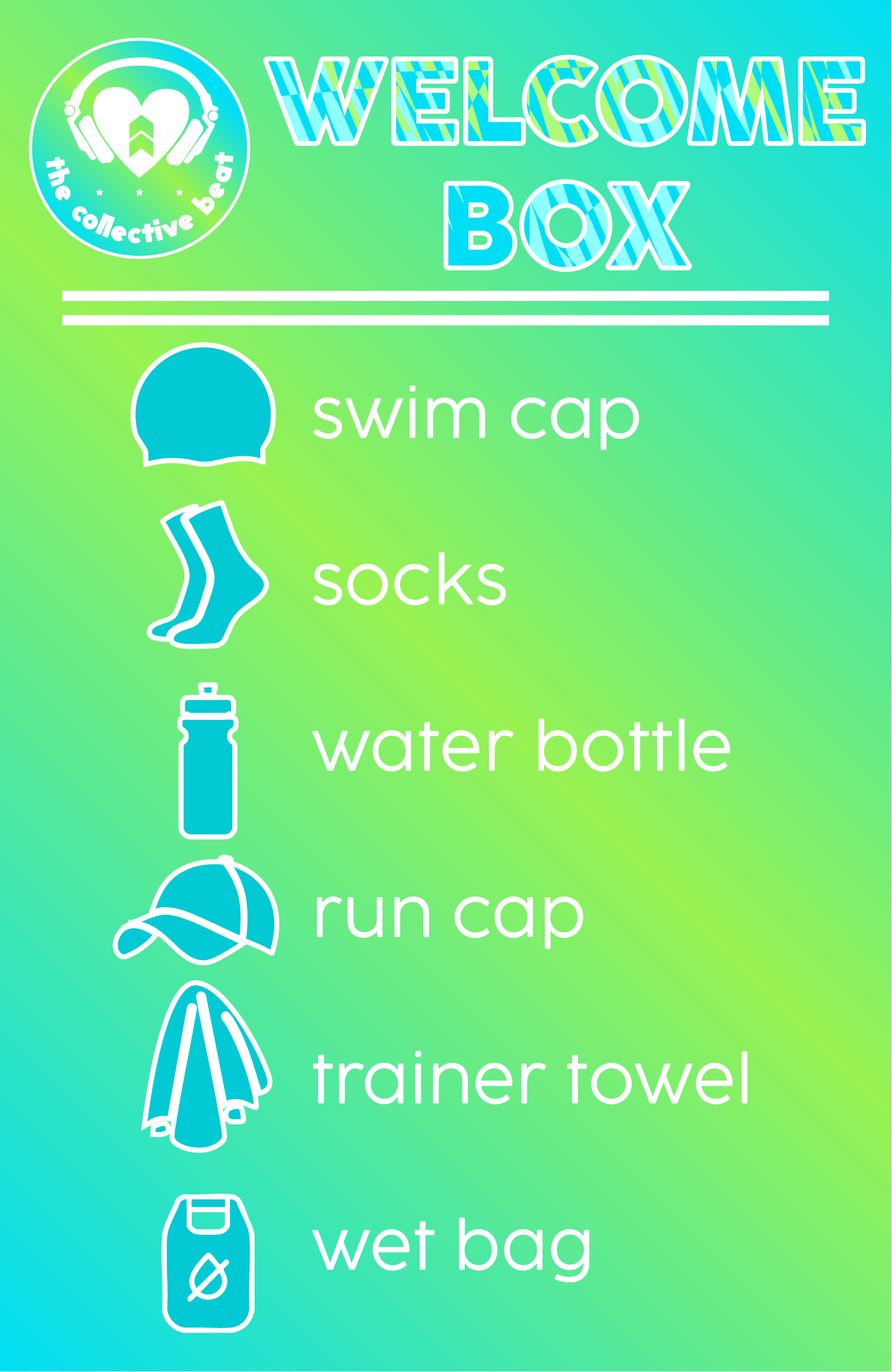 - A Welcome Pack including a water bottle, socks, trainer towel, swim cap, wet bag and run cap worth over $100